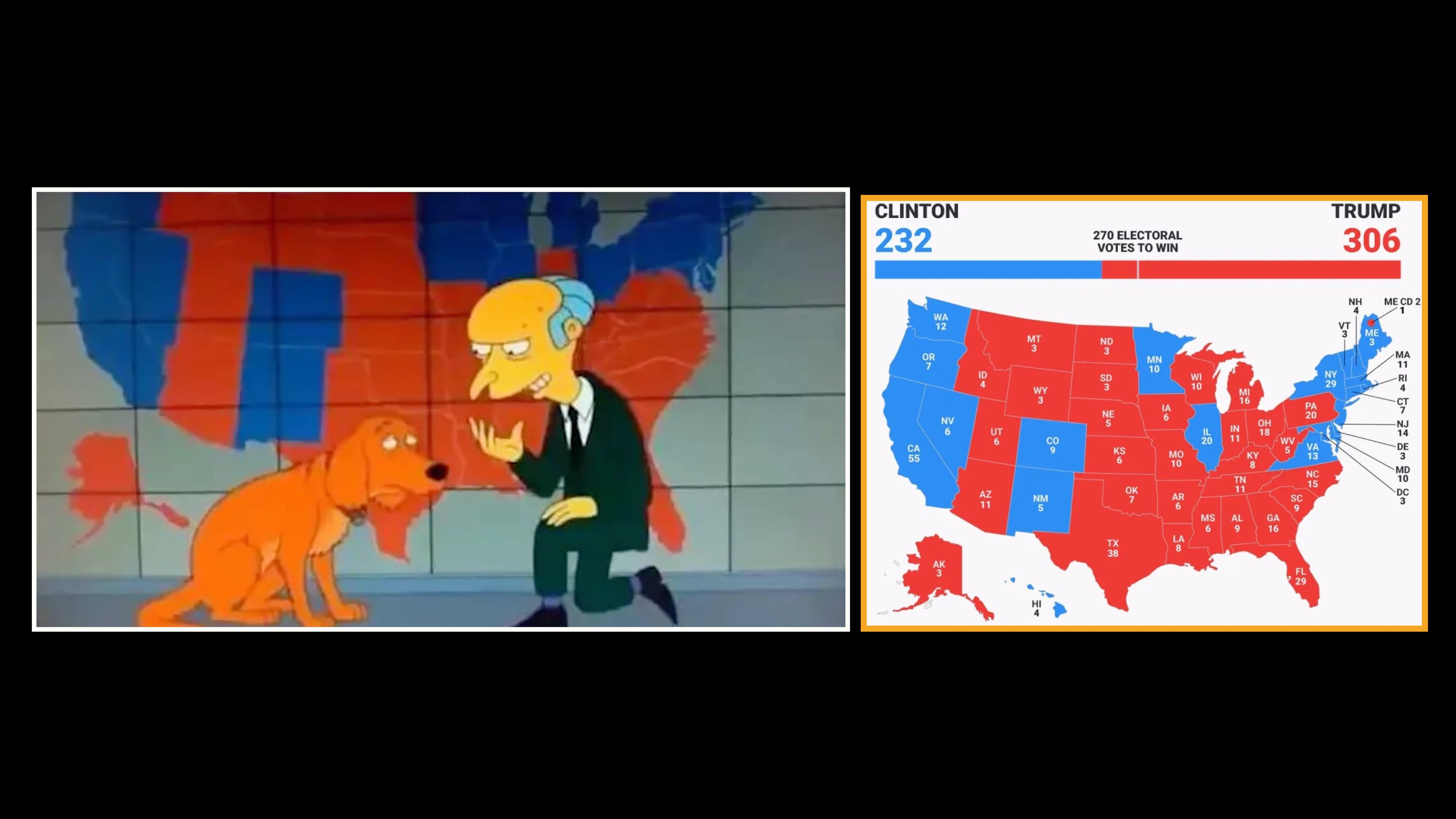 那时的川普还是一个满嘴跑火车的商人,喜欢上电视、蹭热度,画风和现在也差不了太多。把川普竞选总统当玩笑的吃瓜群众们,万万没想到,16年后,他竟然真的当上了美国总统。活久见,大概就是这个意思。来一起看看动画和真实场景的对比,这画风,这领带,就连人物表情也是完美复刻。甚至连16年前动画片中的投票结果,和美国大选的真实投票结果都一毛一样。