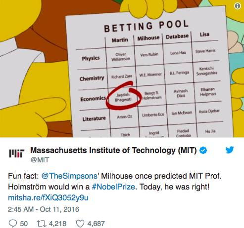 2010年第22季第1集的动画中,一个学生拿出了一张赌注,和大家打赌今年谁会获得诺贝尔奖,这个有点像是《死侍》里的那个死亡池,只不过对象换成了谁会获得诺贝尔奖。lisa的丈夫就押注了本戈特·霍尔斯特罗姆教授会获得诺贝尔经济学奖。结果,2016年拿到诺贝尔经济学奖的正是,麻省理工教授霍尔斯特罗姆教授,有没有惊掉下巴~