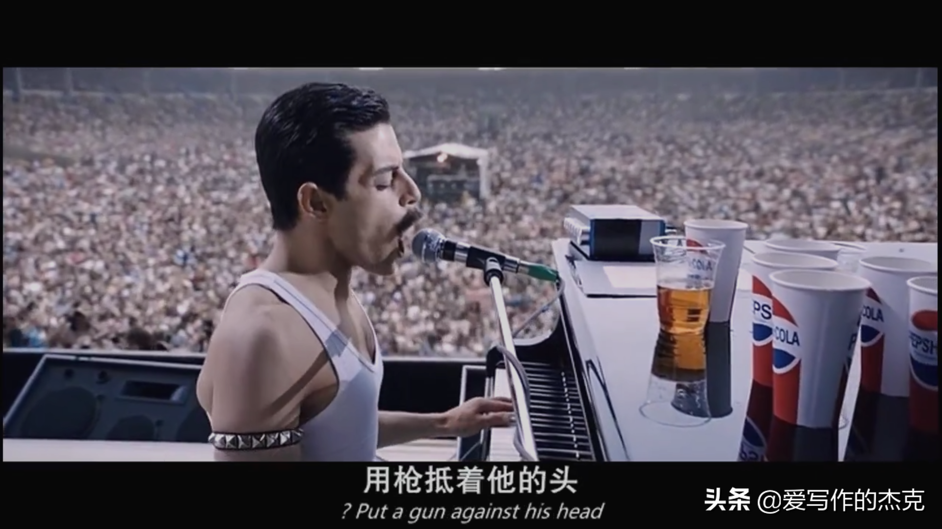 为非洲募捐的慈善义演,可以说是整部电影的高潮。长达二十多分钟的激情演绎,可以说是弗雷迪·莫库里的人生沉舟侧畔,千帆过尽之后,乐观面对绝症和人生时的豁然开朗,所以舞台上的表演,就成了他倾尽全力的真情演出,乐队的每个成员都很卖力,也都激情陶醉。他更是用自己独特的表演,引爆全场。听众火爆,捐款电话被打爆,募捐的数目超额完成,温布利球场被彻底沸腾,全球直播,15亿人观看, queen乐队也达到了自己的巅峰。影片在这个时候戛然而止,赋予观众无限遐想和回味,使主题升华,原来爱可以这样超越个人,变得无私,超越国界。