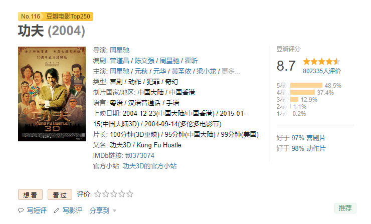 功夫呢,大家都知道,那是星爷电影的巅峰之作,也是星爷所有电影中功夫元素最多的,这部电影在当时的票房是1.7亿多,豆瓣网也开出了8.7分的高分!毫不夸张地说,如果这部电影放到现在,至少是30亿起步!