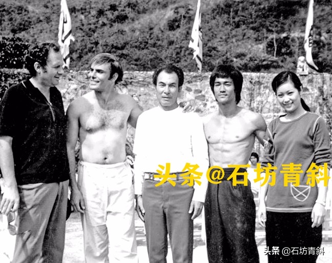 电影《龙争虎斗》(1973)外景地,前排从左至右:导演罗伯特·高洛斯robert clouse、约翰·萨克松john saxon、石坚、李小龙和茅瑛合影