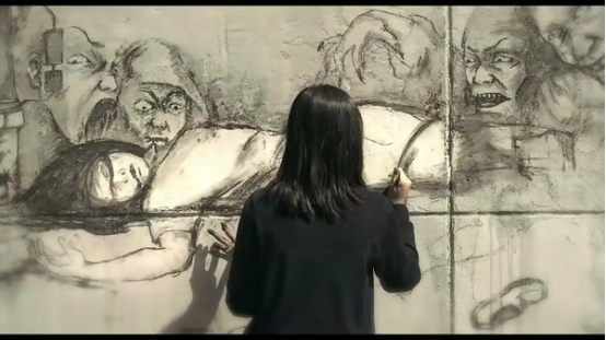 而在电影一开始的时候,女主在画漫画,每次画完一幅漫画都会出现一道红色的,印着血光的墙,所以这个时候我们可以这样猜想,正是因为这道印着血光的墙让鬼魂出来可以借助他人的手为自己报仇。