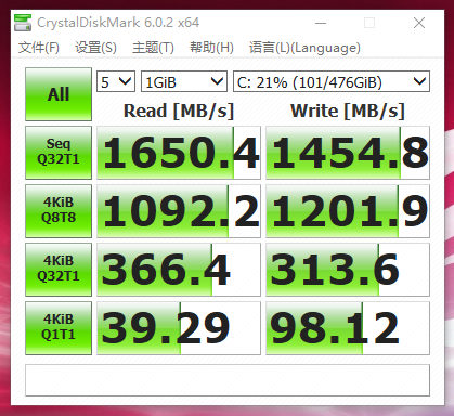 在硬盘方面,冰刃3仅配备了一块512gb nvme ssd,超大容量绝对可以支持玩家在游戏本上下载多款大型3d游戏,让玩家尝试多种游戏带来的乐趣。但不知这款硬盘的读写速度究竟如何呢?为此,选择crystaldiskmark来进行测试,结果显示,这块硬盘的连续读取速度为1650mb/s,连续写入速度为1454mb/s,整体表现非常不错,在游戏运行方面将会有不俗的表现。
