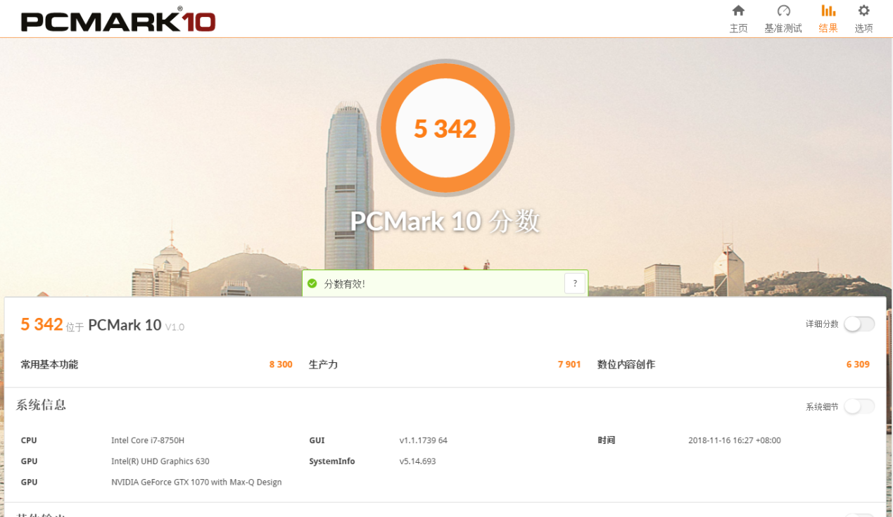 对于冰刃3的整体性能评估,通过pcmark 10进行测试,整个测试过程针对电脑网页浏览、文字编辑、图形处理、视频编辑、多人视频聊天、游戏等诸多常用功能,最后给出一个综合评分,本次测试最终成绩是5342分,说明这款游戏本运行主流游戏或是处理一些常用工作,完全是游刃有余的。