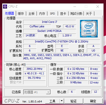 从cpu-z读出的参数来看,冰刃3搭载的这款第八代i7-8750h处理器依然为14nm工艺技术和tdp 45w的热设计功耗,但核心数量有较大升级,从上代的4核8线程设计增至了6核12线程,三级缓存增至9mb,此外,默认标称的满载睿频也得到了大幅度的提升:单核最高睿频可高达4.1ghz,着实让人惊喜了一把。