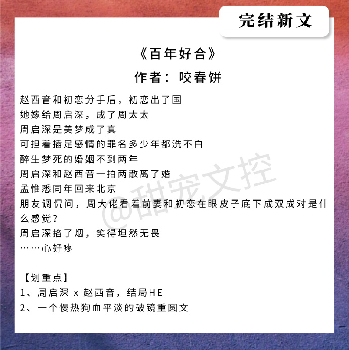 咬春饼的《百年好合》是真好看真甜!破镜重圆+追妻火葬场!开篇就是男女主离婚以后女主回国开始的,然后中间插叙男女主之前的故事。女主是有个初恋男二,但是因为男二家里反对女主和他的交往,女主也觉得自己和男二的想法不一样就分了手,男二就出国了。男主就把握住机会,追求了女主,两人就相恋并结婚了,结婚以后男主和女主是非常幸福,但却出现意外,男主因为一些事不小心让女主受了伤(这里女主流产了),以及一些问题的出现,两人离婚,女主去了国外找姑姑。过了几年,女主回国,和男主相遇,男主就开始追妻火葬场,男二也回了国并且我觉得是作为剧情的主推动人,揭开了一些小伏笔,男女主解开误会后就复婚,生了小包子。