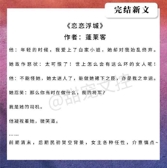咬春饼大大的文笔不用说,每章的章名都好喜欢,整篇读下来很流利舒畅。其实还蛮心疼男二的,有缘无分了。