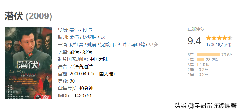 孙红雷和姚晨的《潜伏》已经霸占谍战剧评分榜首十多年了。