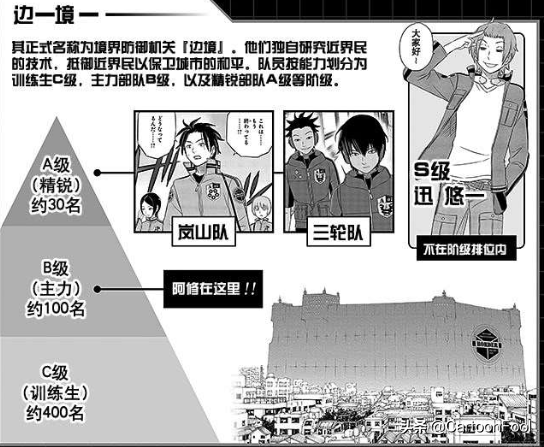 在剧中,主要是近界民和border双方的交锋。border队员由训练生c级,主力部队b级,精锐部队a级,以及黑触发器持有者s级构成。