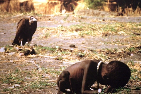 还记得那个骨瘦如柴蜷缩在地上的小男孩,在他身后的不远处,一只秃鹫正虎视眈眈的注视着他的那张照片吗?