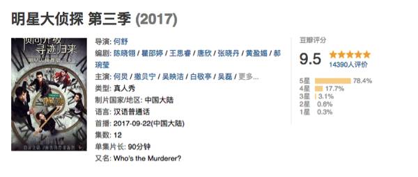 甚至,连主打推理的真人秀节目《明星大侦探》,豆瓣评分竟然飙到9.5。
