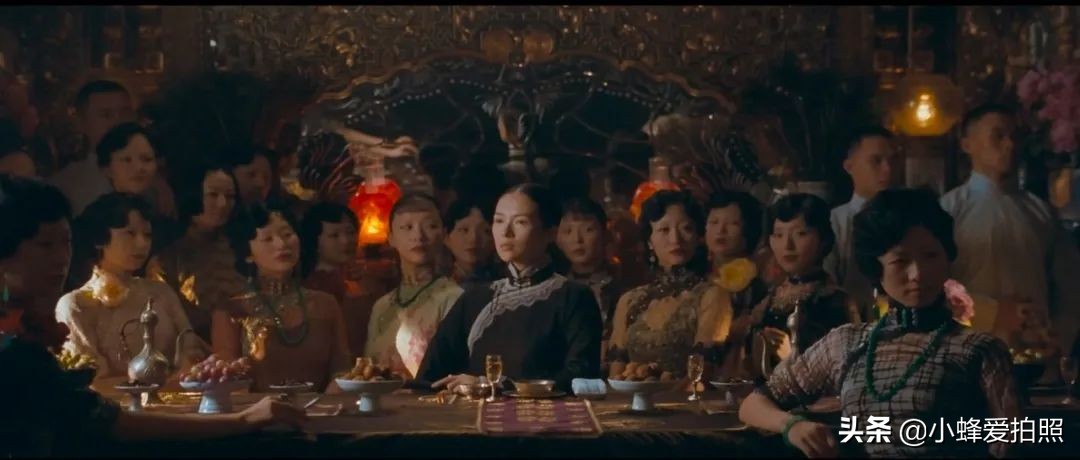 比如这一幕,生生的把电影拍出了西方宗教类型油画的感觉!作为主主体人物的宫二小姐处于画面的正中央,脸上的光照强度相较于其他人是最大的,通过明暗的对比直接突出了主体人物。同时所有画面中的人物,根据不同的位置,每一排的人物脸上的亮度都略有不同,让一层层的人物把整个画面的层次感做到了极致。