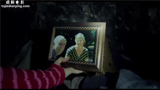 贝卡这边还在地下室里搜寻。找到了外公外婆的照片。拿近点看,比外面那俩正常多了。