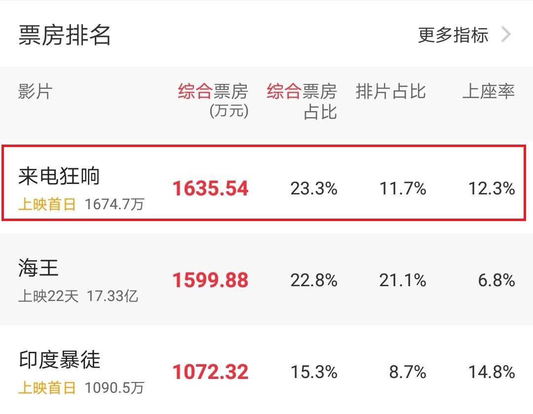 根据猫眼专业版数据,《来电狂响》上映首日,目前实时票房已经超过了dc的超级英雄电影《海王》,强势登顶,暂居单日票房排行榜首位,这也证明了《来电狂响》的受欢迎程度。