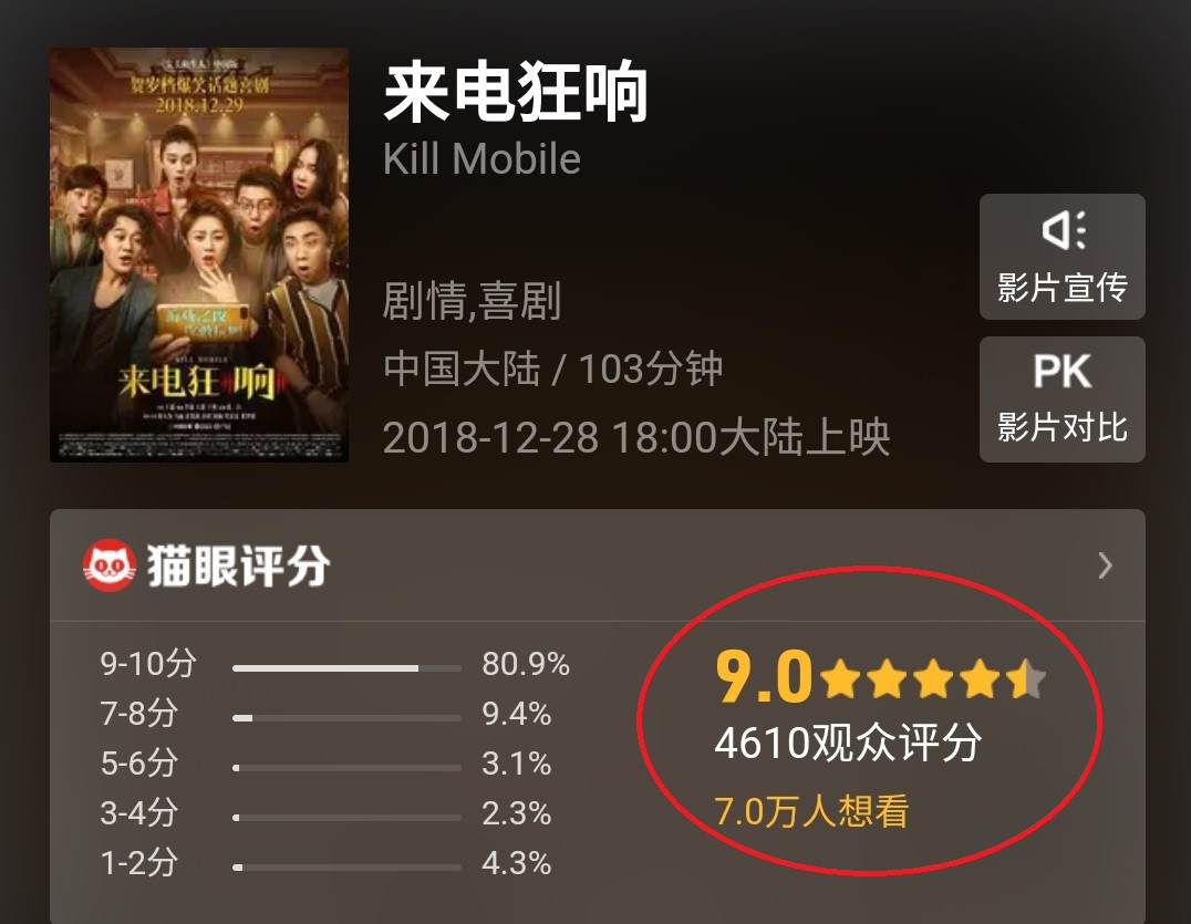 《来电狂响》的剧情十分具有话题性,一经上映就受到了观众们的欢迎,电影的猫眼开局评分高达9.0,是一个相当不错的数字。