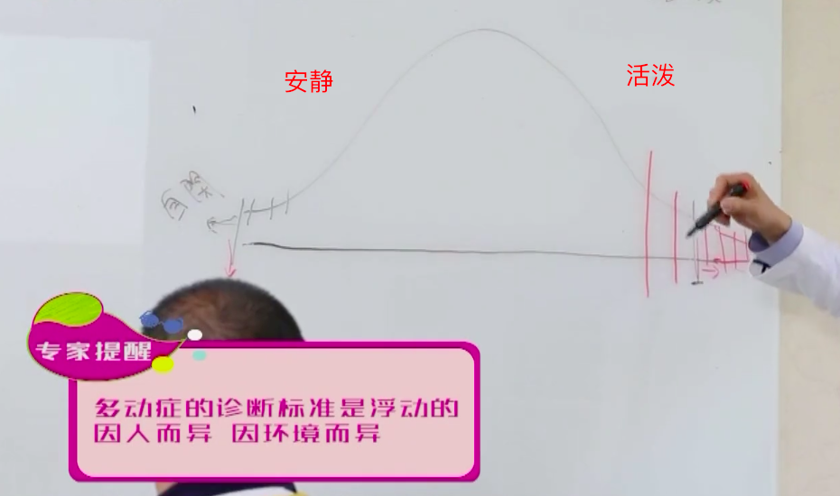 再用一个图来解释一下什么叫注意力不集中跟多动。如果我今天把所有的人,分成很活泼或者很安静,那你想这个世界上的人,会有分怎么样?大部分人是中间,既不活泼也不安静。安静到不行这叫自闭,那太活泼太活泼,最后就是多动症。所以这个到底多安静,我们会把他诊断为自闭,多活泼我们会把他诊断为多动,这个是浮动的。在上海或者北京,很注重安静下来读书,那这个多动的标准就会一直降低,像妈妈对他的标准就比较低。专家组对他的标准就比较高。而艾瑞克的实际情况可能就落在父母与专家组评分之间。