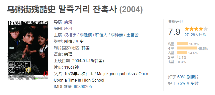 但是美好的东西终将失去,留下的只能在这样的电影中去寻找了。电影在豆瓣评分达到了7.9分,非常推荐初中高中有故事的朋友去看一下。电影中的韩佳人真的非常漂亮,第一次看到差点闪瞎了我的眼睛。有些遗憾的是韩佳人参演的电影不多,而且很早就嫁人了,淡出了大荧幕。后来有一部名字叫做《建筑学概论》的电影,韩佳人也有出演,也是非常美丽的存在。