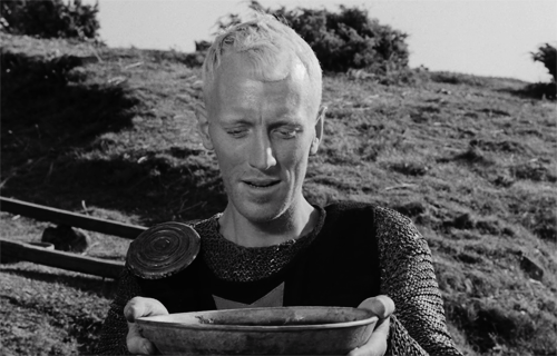 伯格曼的电影,永远在阴沉和无忧无虑,残酷和玩笑之间,做着细致的平衡和拿捏。所以,每次和死神的相遇,都充满了微妙的戏剧性,每次两位骑士之间的对话,都充满了戏谑和幽默。