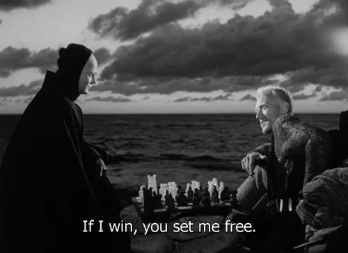 于是骑士布洛克提出,要在临死前和死神下一盘棋,如果赢了死神,他就可以继续生存下去,如果输了,他就甘愿献出自己的生命。