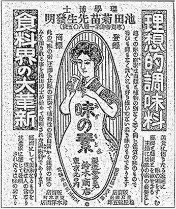 1908年,在一次晚餐中,他发现妻子做的海带黄瓜汤特别鲜美,于是就问她是否添加其它食材,得到否定的答案。池田菊苗觉得,海带当中肯定有特别之处,于是开始研究它的化学成分,提取出了谷氨酸钠,就是它让海带汤变得鲜美。随后,他将谷氨酸钠做成鲜味剂,取名为“味之素”,获得了专利。