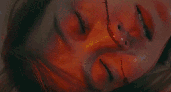 身着白色纱裙的少女从楼梯滚下,面庞朝下,浑身血迹,头顶被插入了艺术节奖杯上的半边翅膀。