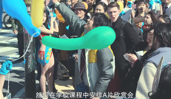村西在街头吹嘘他的情色能拯救日本时,前拥后簇,挤到最前方,笑着拍手的学生还高喊着: