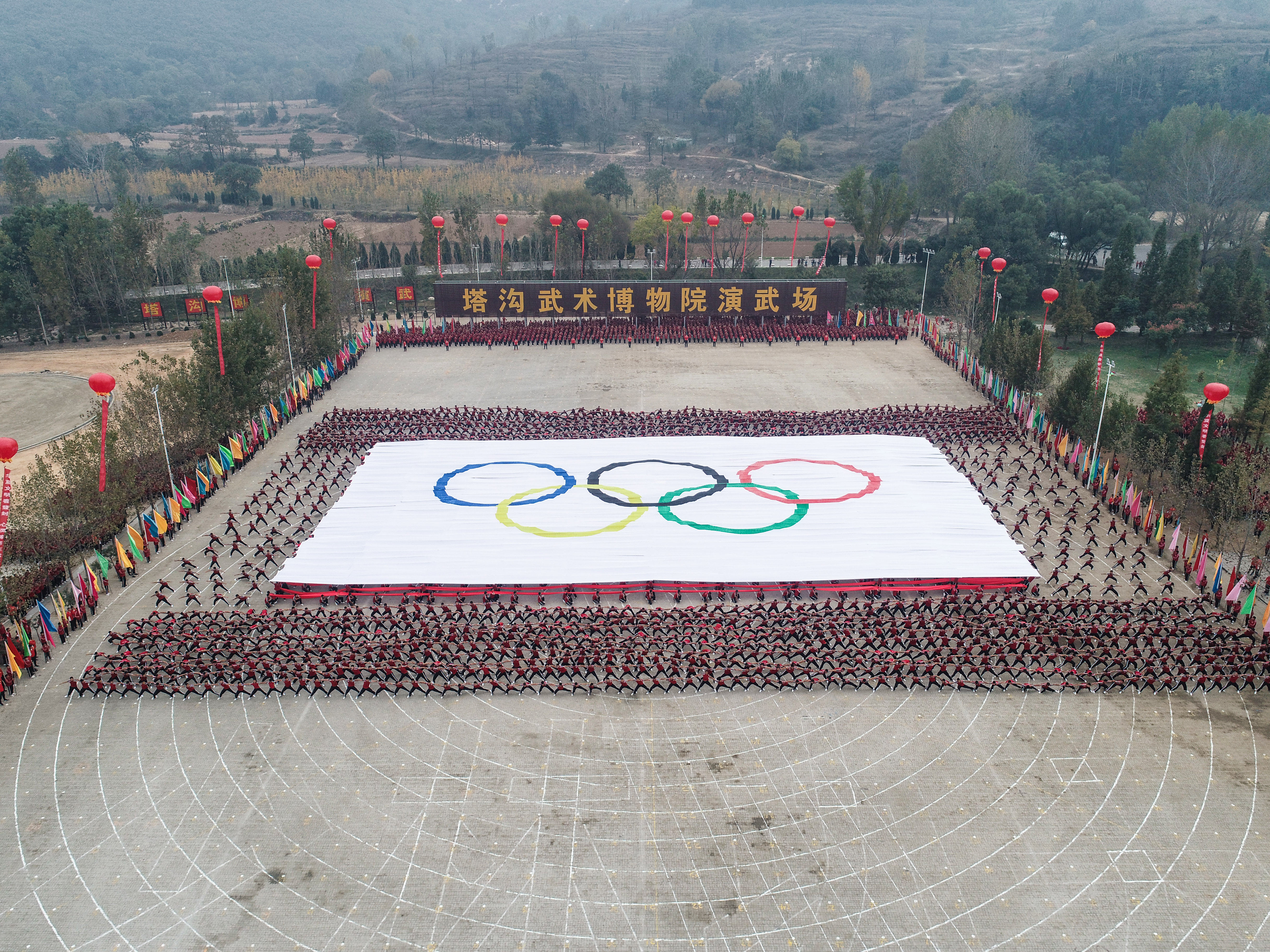 倏忽间,圆形阵型变换为方形,塔沟学员高举五星红旗和奥运会旗,两种旗帜交替出现,交相辉映。