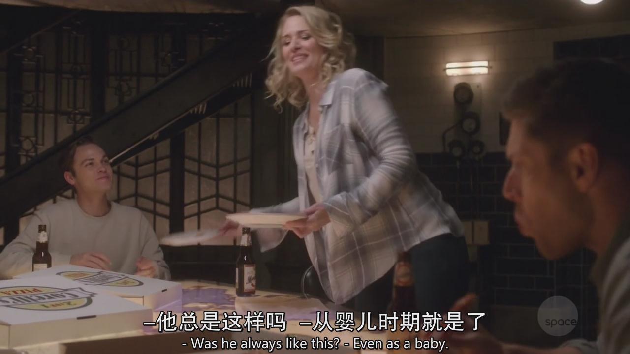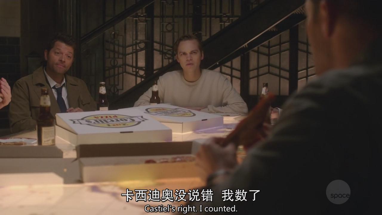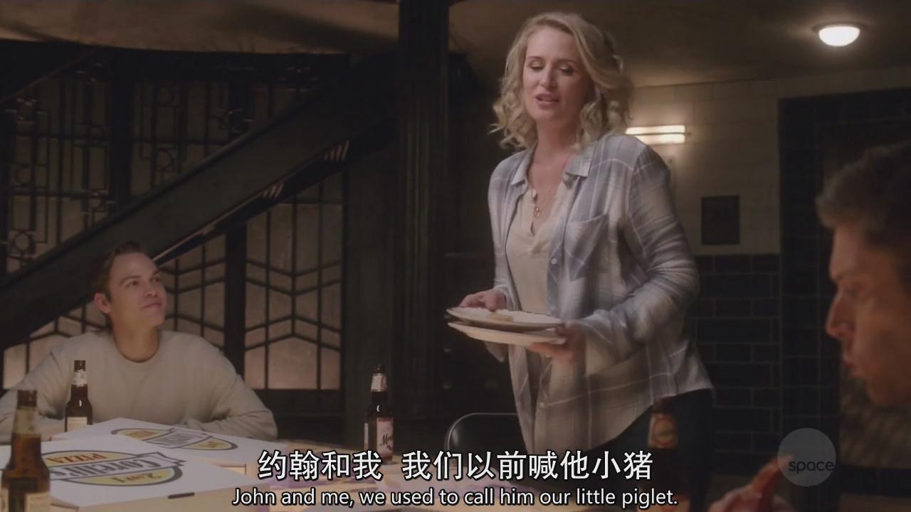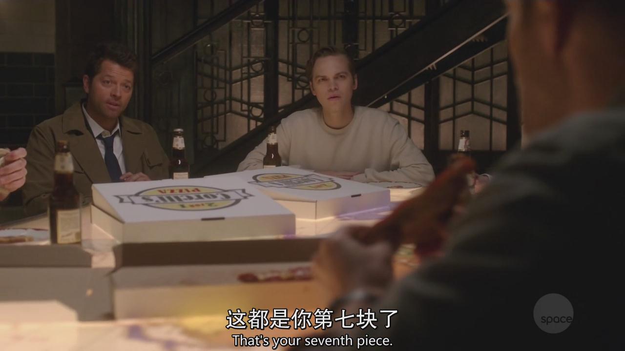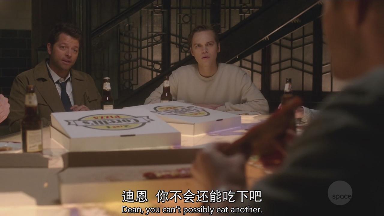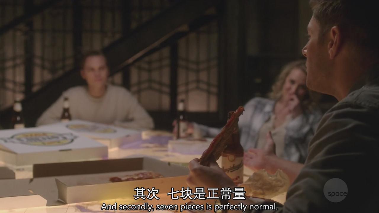 暖男山姆帮妈妈收拾餐具,然后迪恩向小卡做了个勾引的手势,小卡很会意地将自己面前的披萨推了过来,迪恩继续张显吃货本色。
