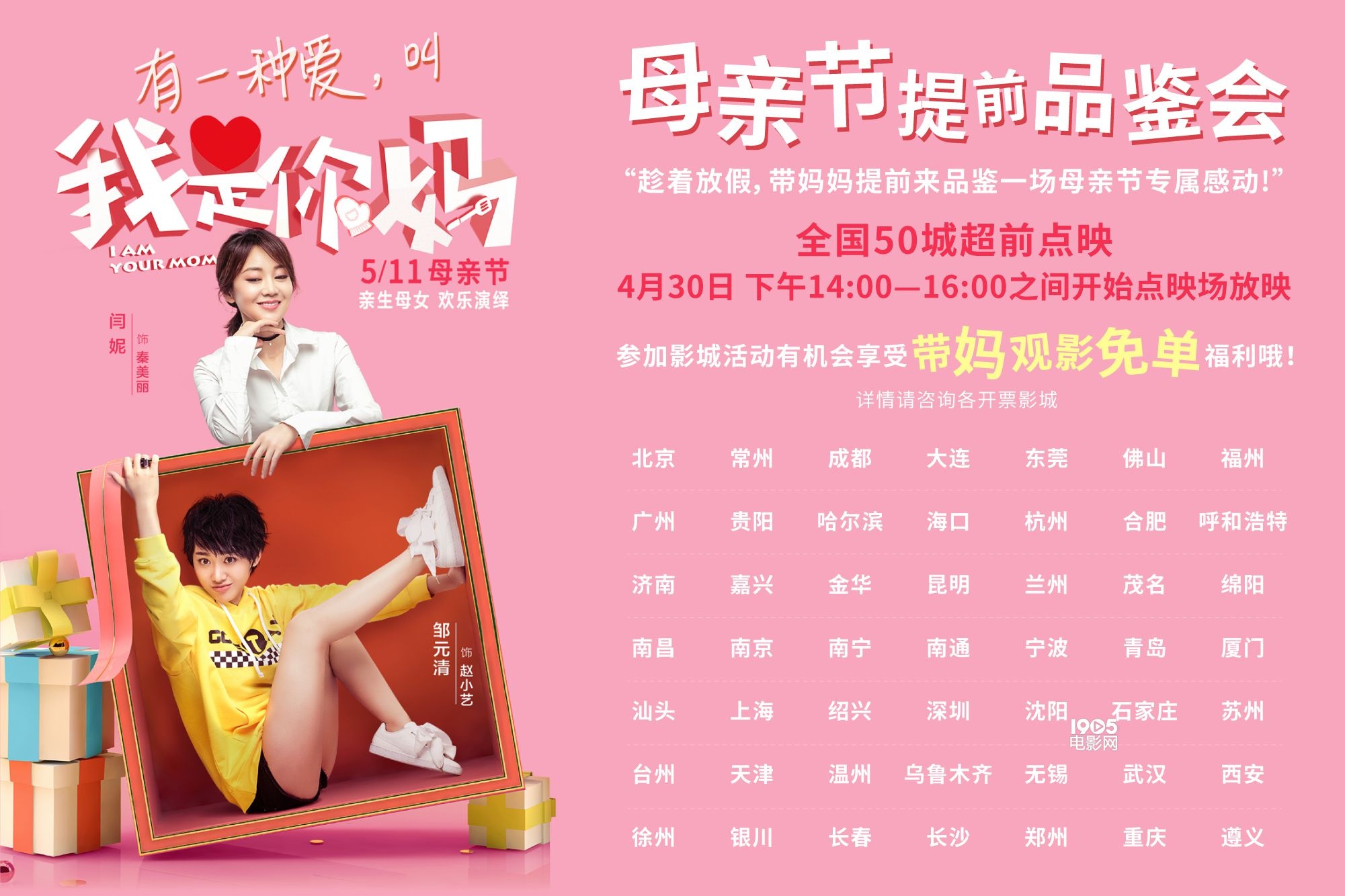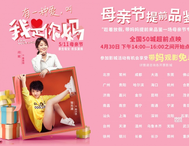 1905电影网讯由闫妮、邹元清亲母女首次搭档出演的都市温情轻喜剧《我是你妈》即将于5月11日母亲节档全国上映。近日,片方也宣布即将于4月30日发动囊括北京、上海、广州、深圳、成都、武汉、南京、西安、天津等近50城、超百场的点映活动,全面开启“母亲节超前品鉴”。