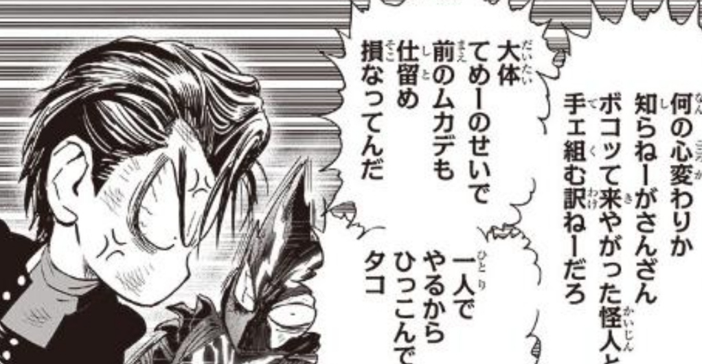 现在饿狼和金属球棒打情骂俏,两人像朋友一样拌嘴交流,饿狼只是一个嘴臭一点的小屁孩,琦玉老师就没有必要再教育他了。除非下一话饿狼亲手把金属球棒打趴下,不然琦玉老师就没有出手的动机。饿狼篇存在的意义之一就是修正饿狼的反英雄人格,现在金属球棒踹一脚饿狼他都不会发狂,饿狼哪里还有什么反英雄人格。