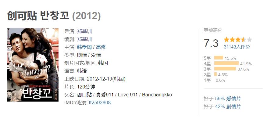 《创可贴》是一部剧情俗套,却温暖感人的韩国治愈系电影。影片于2012年12月19日在韩国上映。虽然表面上是一部轻松诙谐的青春爱情片,实际在男女主角互相治愈的过程中,有对生命意义的深刻探讨,值得一看。