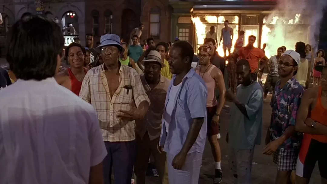 不过,斯派克·李的电影总以悲剧告终:血肉横飞、警棍飞舞、水火交争。导演的艺术手法,多数源自其对琐碎事件和于此相关的人群的着力刻画。犹如给观众逐次介绍喧嚣家庭里的每位孩子,导演每次展示一两个面孔,最后,这些面孔呈现出一幅生动群像。