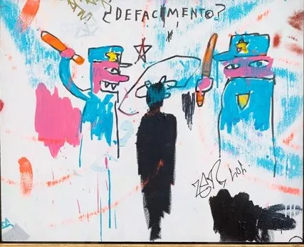 无独有偶,史麦利(smiley)在金博士头上涂画的皇冠和让—米歇尔·巴斯奎特(jean-michel basquiat)用来缅怀过往黑人英雄的皇冠如出一辙。震惊于同为涂鸦艺术家的斯图尔特被谋杀,巴斯奎特绘制《毁灭——迈克尔·斯图尔特之死》(defacement - the death of michael stewart, 1983),以志纪念。