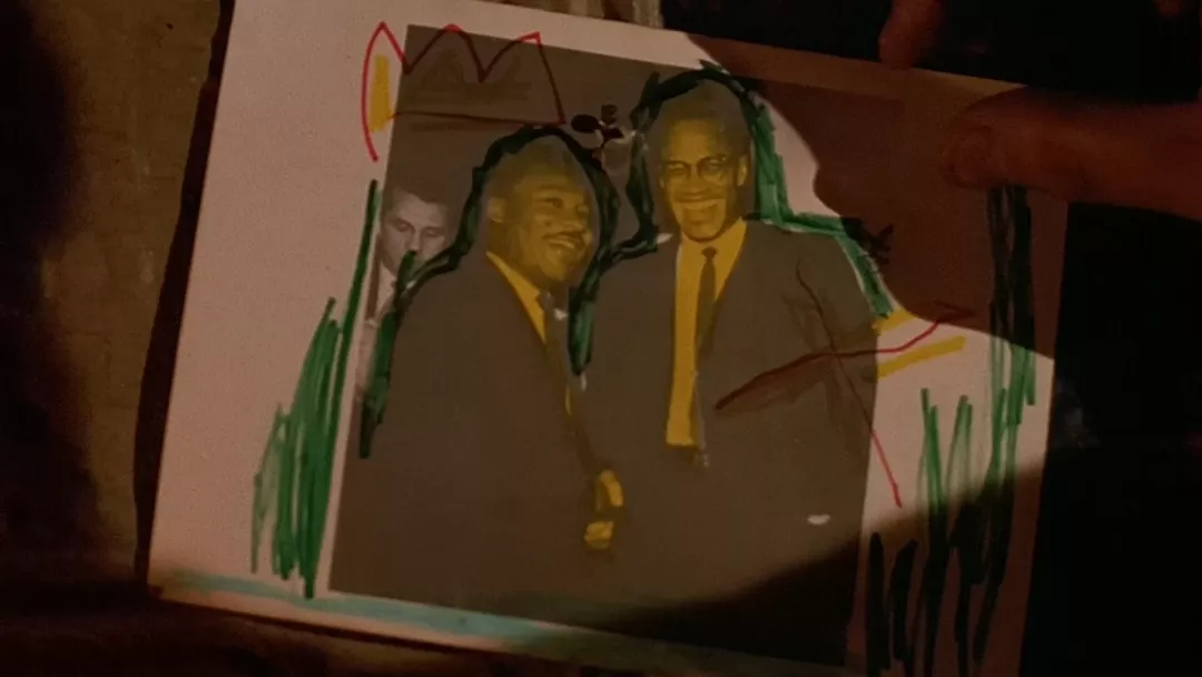 罗杰·格午埃文·史密斯(roger guenveur smith)饰演的史麦利(smiley)步履蹒跚地兜售着潦草涂饰的马尔科姆·艾克斯(malcolm x)和马丁·路德·金(martin luther king jr.)合照;这是另一种展现二者固有公众形象的方式,不同于在圣殿入口外摆摊的虔诚艺人叫卖圣母塑像和袖珍画像。斯派克·李的禀赋在于对其角色形象不可动摇地、近乎笃定地刻画。