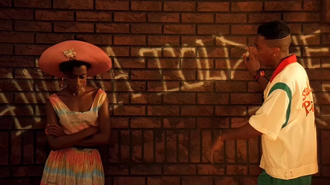 回到角色穆奇(mookie)。在角色中,穆奇饱含危险地、富于成效地跨越颠覆界限,而塑造成典型。或许,斯派克·李想要刻画的这位迷失、并不英俊、全然无伤大雅的年轻人,抑或是导演自我刻画,在《为所应为》(do the right thing, 1989)上映三十年后,依然鲜活如新。同样,让电影得以不可言表般精确地预知出我们身处的时代。穆奇的扮相:复古道奇队衫、精致局部变色荧光短裤和珍藏版耐克鞋,俨然就是当下一位时髦黑人小伙。