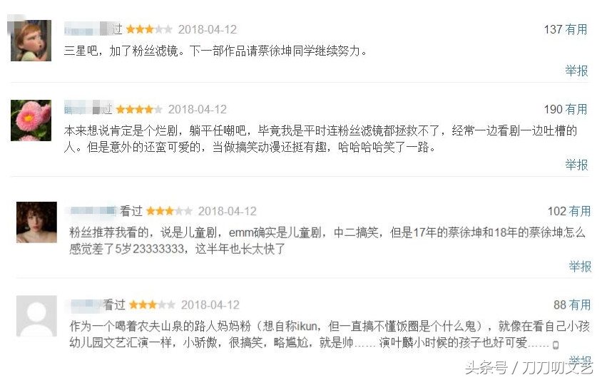 对于蔡徐坤人生当中第一部剧集,不少粉丝们调侃说:“带着粉丝滤镜看,给三星,下一步作品请蔡徐坤同学继续努力”、“确实是儿童剧,中二搞笑”、“意外还蛮可爱的”、“就像在看自己小孩幼儿园文艺汇演一样”。