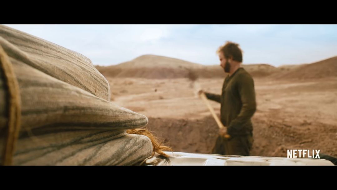 之后是小粉开着车,行驶在美国的大西部,然后用铲子挖坑,可以看到车上此时包裹着一具尸体,隐约能看到黄色的头发,至于这具尸体是谁,目前应该没人能猜到。