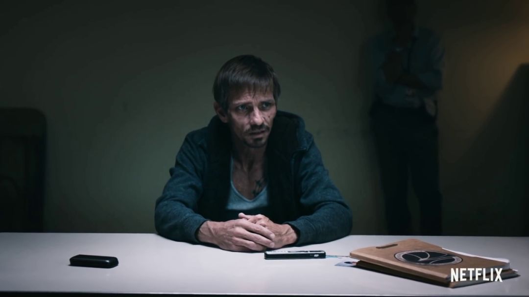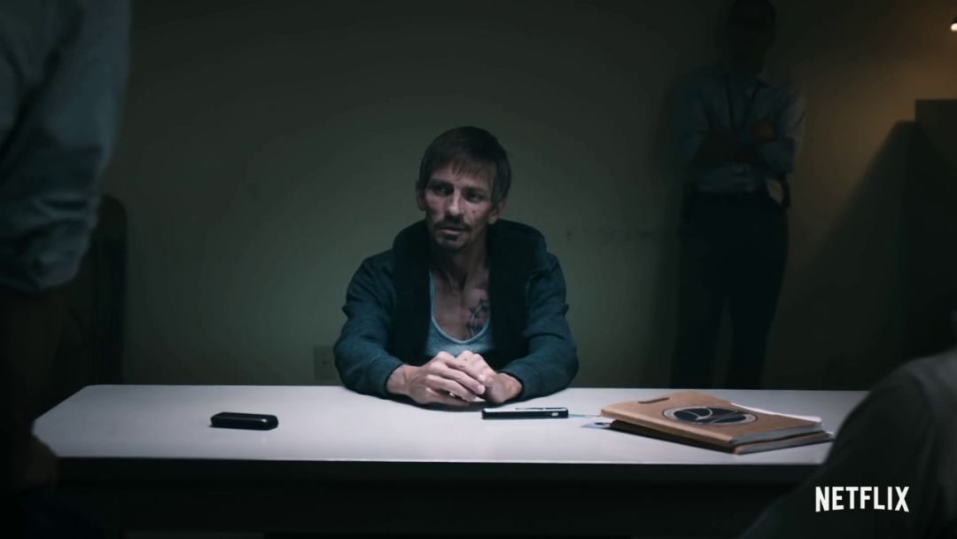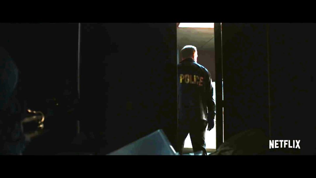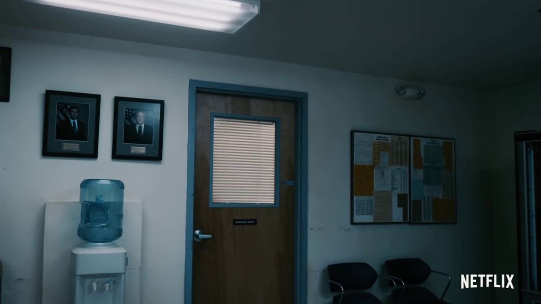预告一开始镜头慢慢推进审讯室,值得注意的是审讯室的外墙,有两张警察的照片,这两位警察正是汉克和他搭档的。