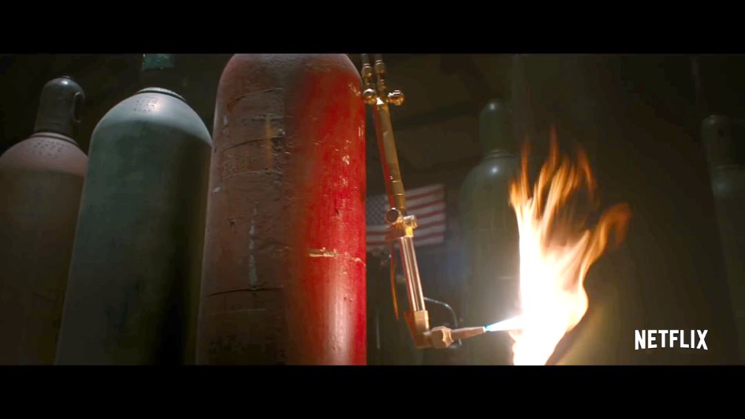 小粉点亮打火机,潜入工厂,里面还有用燃气罐开火烧着一个容器,而且背景还是美国国旗。