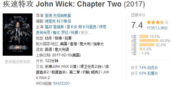 基努·里维斯的新片《疾速特攻》目前豆瓣评分7.4,比第一部《疾速追杀》更加出色。