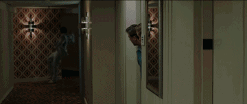 不顾服务生的提醒,充满责任感地走进电梯。在到达酒店顶层后,左边是一个捂着脖子血流不止的人,右边则是枪战现场,还有身后正在往下掉落的人影。两人不发一言,无比默契地同时后退一步站回电梯,在第一时间逃离现场,开车按原路返回。