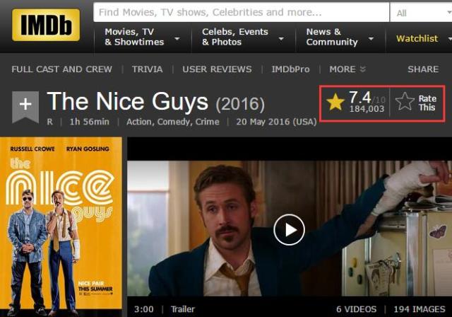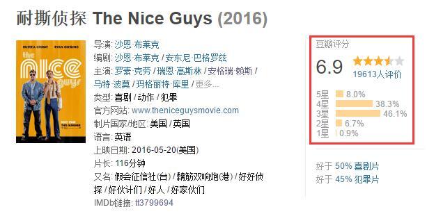 影片《耐撕侦探》于2016年在美国上映。目前,豆瓣评分6.9分,imdb评分7.4。imdb的评分一向比豆瓣要更为严格一些,甚至其中有的低分会感觉到些许的“不近人情”。但这次,在圈圈看来,imdb的7.4分对于这部电影来说才更为合理一些。