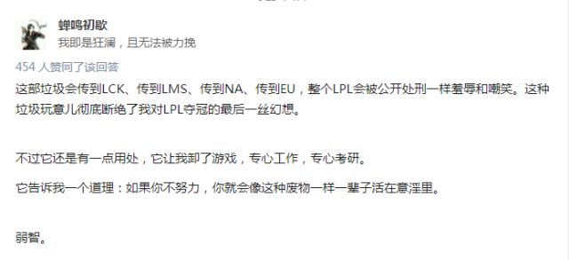 开头所提及的网大《lgd超神归来》播放量仅有251万,豆瓣评分也是电竞题材的豆瓣最低分。这部电影质量的低下甚至引发了玩家对于中国电竞的失望情绪。网友蝉鸣初歇的回答获得了454人的赞同。
