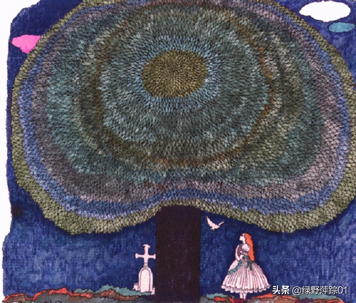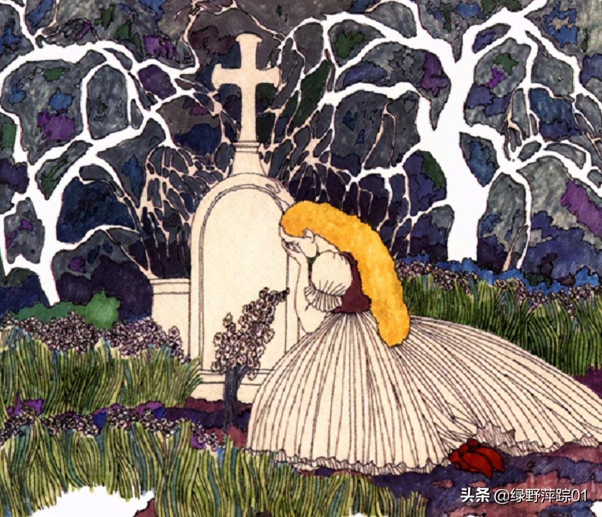 这个小女孩失去了母亲,也就失去了母爱。她思念母亲,每天到后花园哭泣,下雪的时候,就给母亲的坟头盖上白色的毛毯。春天到来的时候,就取下毛毯,扫掉坟上的积雪。小女孩每天都这样,把她对母亲的爱悄悄地对着坟头倾诉。