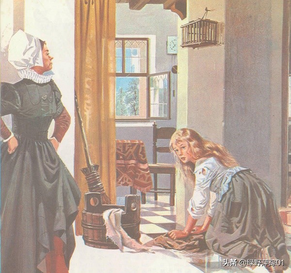 小女孩的后母外表美丽,内心却很丑陋,她脱掉了小女孩漂亮的衣裳,给她换上了灰色的旧外套,把她当做佣人使唤,不干活就不给面包吃。小女孩每天担水、生火、做饭、洗衣,还要被后母的两个女儿讥讽嘲弄和折磨,比佣人还不如。