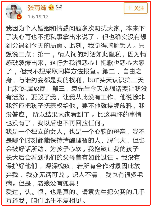 就在大家以为张雨绮女神形象崩塌时,张雨绮火速发长文回应,逐一批驳袁巴元的爆料。