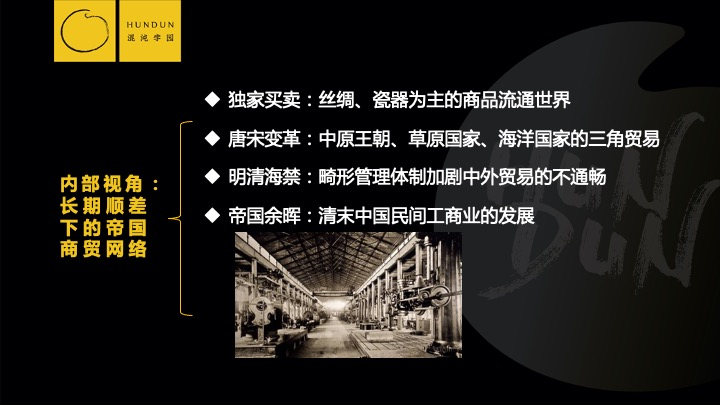 两次鸦片战争以后,中国长期积贫积弱,被洋人卡着脖子,五个口岸都被卡着脖子,税收被卡着脖子,货币也被卡着脖子,因为要用英国的货币作为全球的准则。这些现象使得中国的贸易根本就站不好,站不直,在二战以后才慢慢好起来。这种政治力量跟军事力量介入外贸是不应该的。