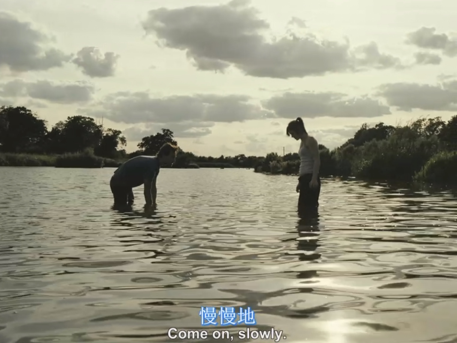 再比如,当真正有人进入米娅的生活时,米娅小心翼翼却又试探与迎合着他人的关注。康纳的行为举止不同于米娅所接触的任何粗鲁之人,康纳会凝视米娅、赞美米娅、鼓励米娅,同样,米娅亦情不自禁地凝视着这个特殊的男子,康纳的凝视逐渐升华为米娅的精神指引与依赖。当一家人出游,只有米娅帮助康纳下河捕鱼时,米娅对康纳的态度暧昧不明,而当石子划破脚底、鲜血流出后,则已明示米娅对康纳的动情再难掩饰。