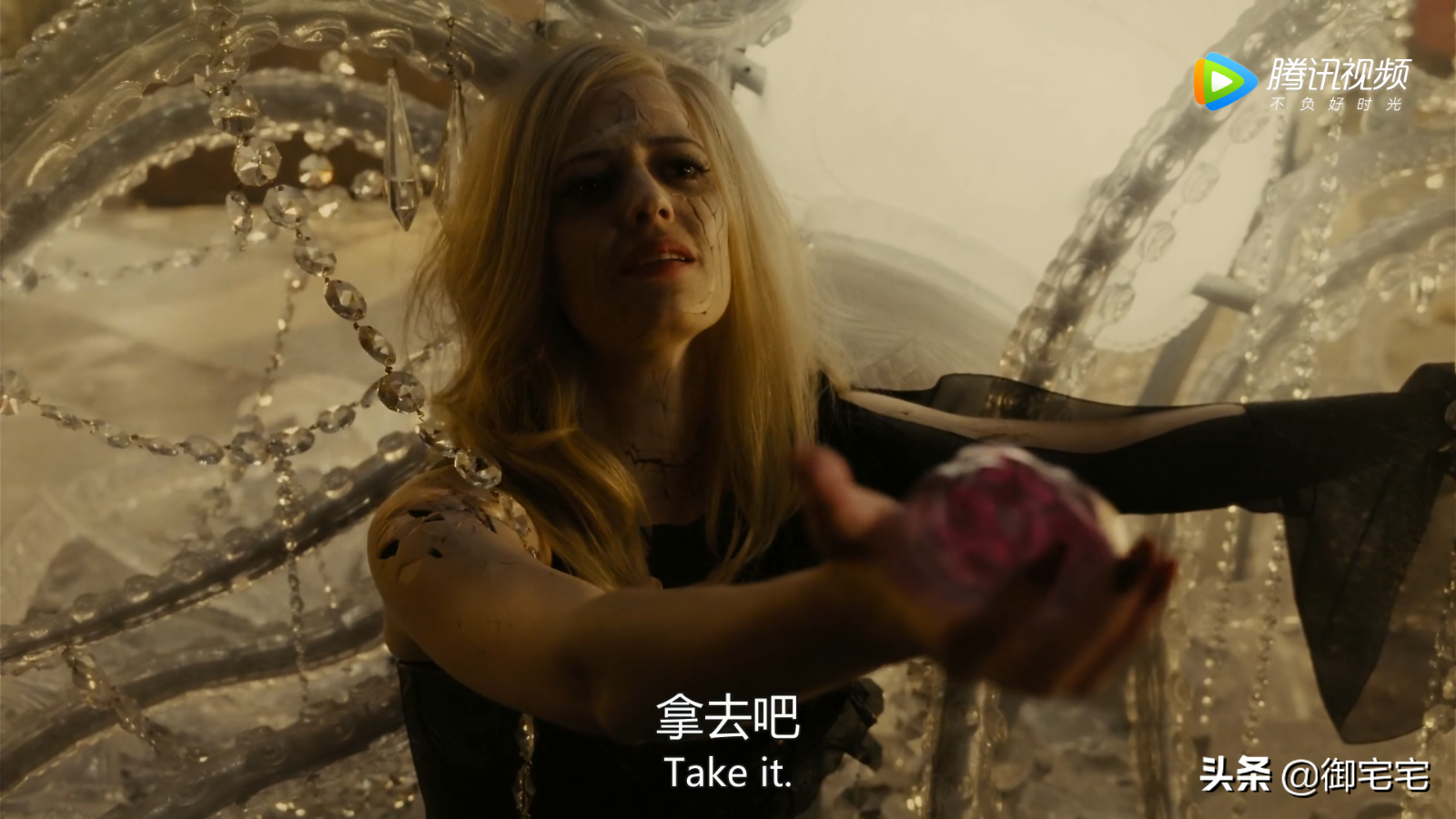 女巫安琪莉可用满是裂痕的手将紫红色的心脏递到吸血鬼巴纳巴斯的面前说道:“拿去吧。”吸血鬼巴纳巴斯迟迟不肯去接,心脏像玻璃一样碎裂开。此时女巫安琪莉可的爱是卑微的,就算为他赴汤蹈火,他不喜欢她,他也只是冷冷看着你掏心掏肺。
