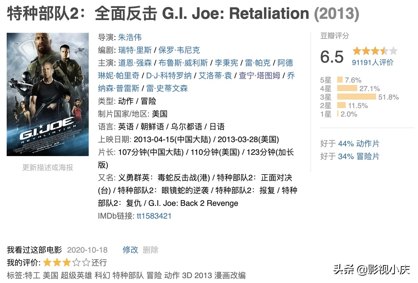 hey,小伙伴们,小庆姐又来啦!这回来写写好莱坞科幻商业大片续作《特种部队2:全面反击》,由华人导演朱浩伟接棒,故事延续第一部《特种部队:眼镜蛇的崛起》,继续讲述特种部队和眼镜蛇之间的战争,豆瓣评分6.5,小庆姐只给它3星,如果不考虑逻辑,只看打斗场面,这个电影可以去看看。
